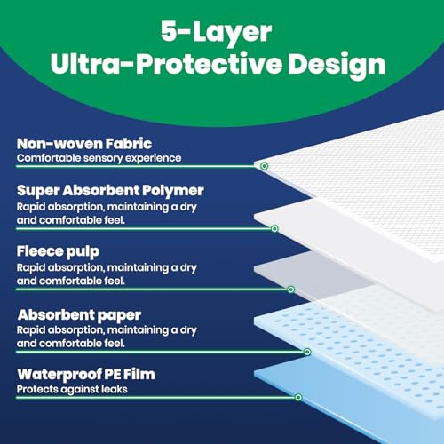 【5-Layered Design for Ultimate Protection】Roinoim disposable bed pads features a five-layer construction, with a soft and comfortable surface layer. In the middle, three types of absorbent materials quickly absorb and lock in moisture. The bottom layer is made of PE film, providing a leak-proof barrier.